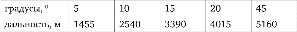 Используя таблицы внешней баллистики, специалисты определили зависимость дальности полета ядра в функции от углов бросания: