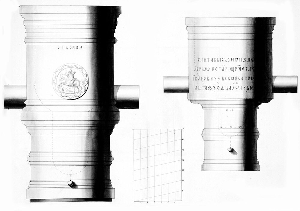 На этом же листе слева помещен чертеж другой большой мортиры (по пропорциям больше чоховской пушки) с чеканной (?) надписью кириллицей «Отвоява» и медальоном на тулове, в котором изображен ездец в рыцарских латах, поражающий копьем повергнутое четырехлапое чудовище. Когда оно было отлито, к сожалению, неизвестно. Медальон со св. Георгием выполнен в ренессансной традиции итальянским или немецким литейщиком XVI в. Но вот вопрос – где отлита мортира, в Москве иностранным мастером или же она – трофей времен Ливонской войны, которому присвоили имя «Отвоява», т. е. отвоеванная? Это орудие также захвачено шведами в Новгороде, 10 июля 1614 г. вывезено в Швецию и переплавлено в 1730-х гг.