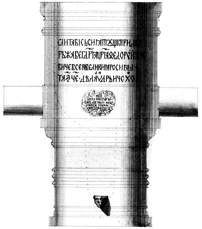 Вышеприведенные описания отнюдь не исчерпывают все сведения о больших орудиях, отлитых в 1585–1592 гг. Так, в 1590-х гг. упоминаются тяжелые пищали «Сокол» и «Раномыжская», которые, возможно, также были изготовлены в этот период. Известно, что первое орудие (калибр 36 фунтов) принимало участие в русско-шведской войне 1590–1592 гг. Второе орудие также упоминается в 1590–1592 гг., а затем в течение всего XVII столетия находилось во Пскове. Во время одного из псковских пожаров «Раномыжская» пришла в негодность и в 1685 г. была заново перелита Я. Дубиной. Хотя новоотлитая пищаль по своим характеристикам повторяла калибр, размеры и декор «Раномыжской» XVI в. («а из дела в та пищаль вышла мерою и ядром по кружалу против прежней пищали, и вычищена, и высверлена, и летописные слова против образцового писма, каковой прислано под вашей государьскою грамотою, и травы на той пищали высечены и расконфарены» (выделено мной. – А.Л.). В 1700 г. пищаль была захвачена войсками Карла XII под Нарвой. На одном из рисунков Я. Телотта запечатлено упомянутое орудие.