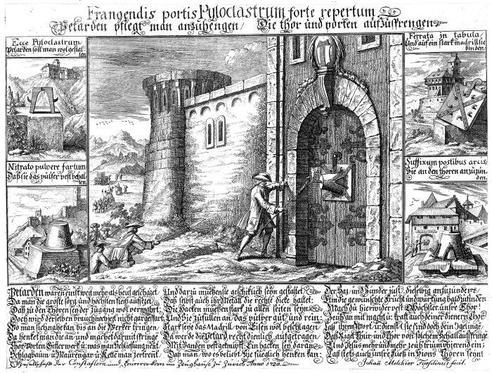 Гравюра из цюрихского альманаха демонстрирует устройство петарды и способ ее применения. Эту тяжелую конструкцию (бронзовый «колокол», наполненный порохом и плотно приделанный к окованной железом доске) нужно было скрытно принести и прикрепить к воротам, которые затем выламывались направленным взрывом.