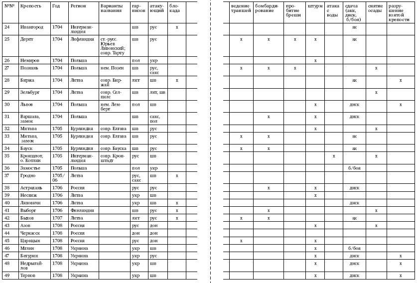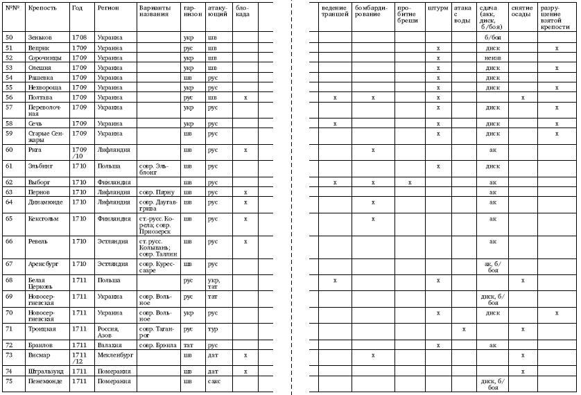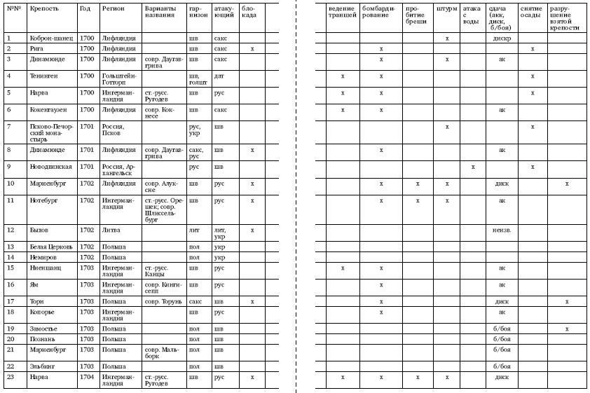 Первая типология осад Северной войны была предложена Ф. Ф. Ласковским, который по критерию «способов взятия крепостей» описал 26 случаев овладения укрепленными пунктами в период петровского царствования. Его выборка, несомненно, включает наиболее значительные эпизоды крепостной войны, но, тем не менее, не покрывает многие иные осады с участием русских войск и вообще не касается операций, веденных союзниками и противниками в Северной войне. Настоящее Приложение – попытка свести информацию о всех отдельных осадах, произошедших за годы войны.