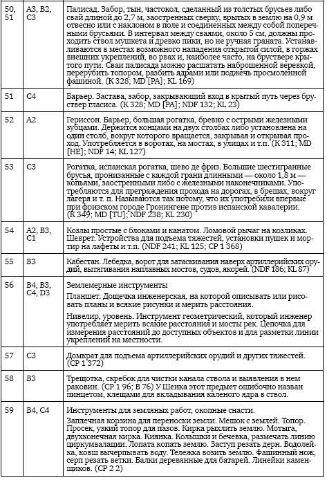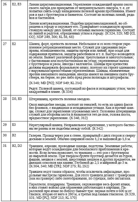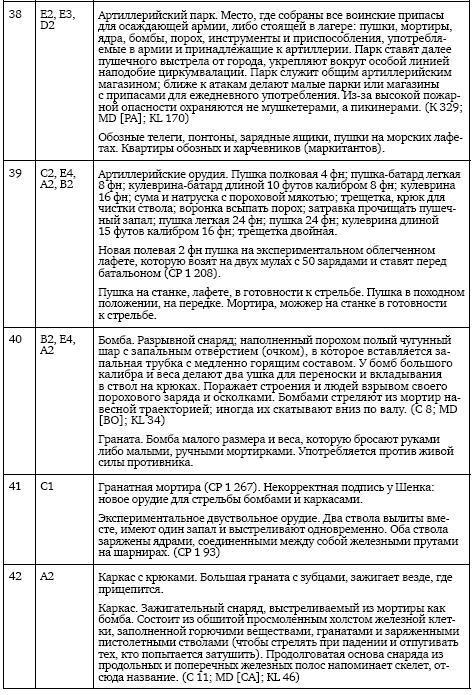 Погружаясь в тематику осадного искусства и фортификации, исследователь встречается со множеством специальных терминов. Необходимо знать, какое значение вкладывали авторы Петровского времени в те или иные слова, какие альтернативные названия встречались, но также необходимо представлять, как все это выглядело. Трактаты эпохи часто были хорошо иллюстрированы; но как правило это были многочисленные разрозненные страницы гравюр среди текста книг. В настоящем приложении мы публикуем редкий гравированный лист, позволяющий увидеть практически все интересующие предметы сразу: «Таблица вещей, относящихся к военному искусству, строительству крепостей, артиллерии, а также к осадам городов, полевым сражениям, лагерям и сражениям на море». Его издал в 1703 г. в Амстердаме голландский гравер Питер Шенк и сегодня он хранится в коллекции Государственного музея Нидерландов. Подписи на самом листе у объектов даны по-французски, за рамками – на голландском языке. Изображения во многом отображают французский взгляд на военное искусство. Так, артиллерийские орудия заимствованы из французского трактата Сен-Реми 1697 г.; изображенным строям пехоты даны названия французских полков; среди инженерных приспособлений нет «шерстяных мешков», которые, видимо, были больше распространены среди немецких инженеров. Таблица Шенка носит, несомненно, компилятивный характер. Как и многие иллюстрированные трактаты по военному искусству своего времени, она содержит ряд предметов, которые вышли из практического применения, но продолжали кочевать из одной книги в другую. Примером тому служат многочисленные «артифициальные вещи» – сложные в изготовлении зажигательные приспособления; их эффективность, несмотря на их устрашающий внешний вид, оказалась не выше, чем у простых бочек с порохом, бомб и гранат. Попали на гравюру и явно экспериментальные образцы, не имевшие сколь-нибудь широкого применения, например двуствольная пушка или складной облегченный полевой лафет. Тем не менее Шенк в целом наглядно отобразил специфику фортификационного и осадного дела, характерную так или иначе для всей Европы, и потому важную и для историков Северной войны. Изображения сделаны в духе своего времени, но, очевидно, раньше, чем появились гравированные иллюстрации к книге Вобана. Последние в течение XVIII в. стали своего рода эталоном, без изменений копировались в разных изданиях и были практически единственными иллюстрациями такого рода. Не удивительно, что работа Питера Шенка попала и в коллекцию Петра Великого. В собрании рукописных карт, планов и чертежей Петра I в Российской библиотеке академии наук есть несколько экземпляров: оригинал с французскими и голландскими подписями, выполненные в России копии без текста и одна копия с русскими надписями. Последняя, озаглавленная «План архитектуры воинской или наука фортификации, осад, баталий, марша армии и лагерей», удачно передает колорит петровского языка, но часто грешит неточностью перевода.