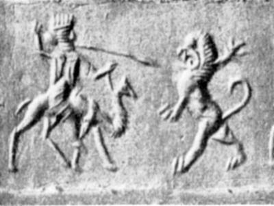 Рис. 75. Едущий на верблюде царь, поражающий льва. Ахеменидская печать. Воспроизведено по: Frankfort Н. Cylinder Seals: A Documentry Essay on the Art and Religion of the Ancient Near East. London, 1939. Pl. XXXVII m.