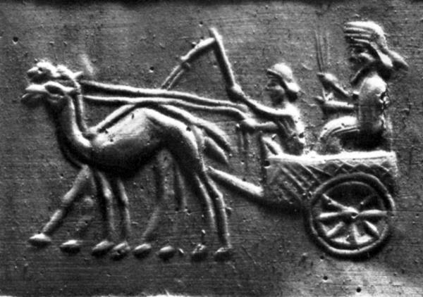Рис. 76. Жрец, едущий на повозке, запряженной двумя дромадерами. Ахеменидский халцедоновый цилиндр. Badisches Landesmuseum (Карлсруэ), 73/ 113. Воспроизведено по: Collon D. First Impressions: Cylinder Seals in the Ancient Near Orient. London, 1987. P. 160, № 735.