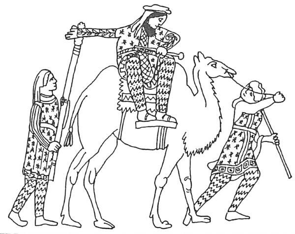 Рис. 77. Как считается, ночная процессия бога Сабазия в восточной одежде, сидящего на бактриане. Краснофигурный аттический лекиф (начало IV в. до н. э.). Британский музей. Воспроизведено по: Bittner S. Tracht und Bewaffnung des persischen Heeres zur Zeit der Achaimeniden. München, 1985. Taf. 7.2.