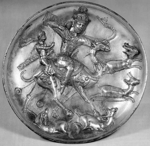 Рис. 78. Серебряное с золочением блюдо диаметром 20,1 см с изображением охоты шахиншаха Бахрама V Гура (420–438); позади шаха сидит его возлюбленная гречанка Азада. Северный Иран (V–VI вв.). The Guennol Collection, Метрополитен-музей, Нью-Йорк. Воспроизведено по: Harper P. О. The Royal Hunter: Art of the Sasanian Empire. New York, 1978. P. 48, fig. 12.