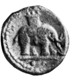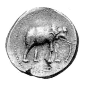 Рис. 19. Серебряная монета из Кампании, без легенды (конец III в. до н. э.). Возможно, представлен африканский слон, поскольку голова животного ниже спины и два «пальца» в кон це бивней. Воспроизведено по: Bar-Kochva В. Judas Maccabaeus: The Jewish Struggle against the Seleucids. Cambridge, 1989. P. 588 pl. XIVc.
