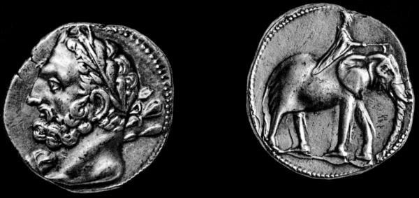 Наличие одного погонщика на спине слона, показанного на монете Баркидов, также не может служить доказательством отсутствия башни у боевых животных, ведь изображения на монетах всегда символичны и несут на себе определенную идеологическую нагрузку, влияющую на выбор сюжета и композицию. Так, например, на монетах Селевкидов, которые, без всякого сомнения, использовали слонов, вооруженных башнями, мы обычно видим неснаряженных символичных слонов и лишь изредка слонов с одним корнаком – полный аналог карфагенской монеты.