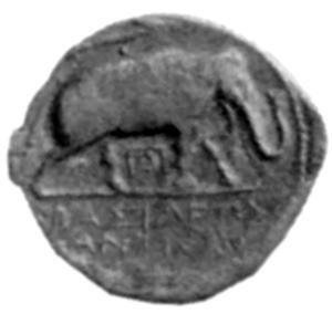 Рис. 21. Бронзовая монета царя Антиоха III времен Пятой сирийской войны (начиная с 202 г. до н. э.). Аверс: македонский щит с горгонейоном в центре, реверс: слон. Воспроизведено по: Houghton A., Lorber С. Seleucid Coins: A Comprehensive Catalogue. Vol. II. New York; London, 2002. Pl. 90, № 1089.3a.