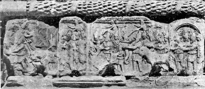 Рис. 23. Персидские посланники предподносят дары императору Галлерию: двух львов и слонов с наездниками. Справа в арке – начальники персов. Арка Галлерия в Фессалониках (298 г.). Воспроизведено по: Μακαρόνα X. Ρ. Ή Καμάρα τό θριαμβικά τόξ τοϋ Γαλερίου στή Θεσσαλονίκη. Θεσσαλονίκη, 1969. Σέλ. 47. Πίν. 44.