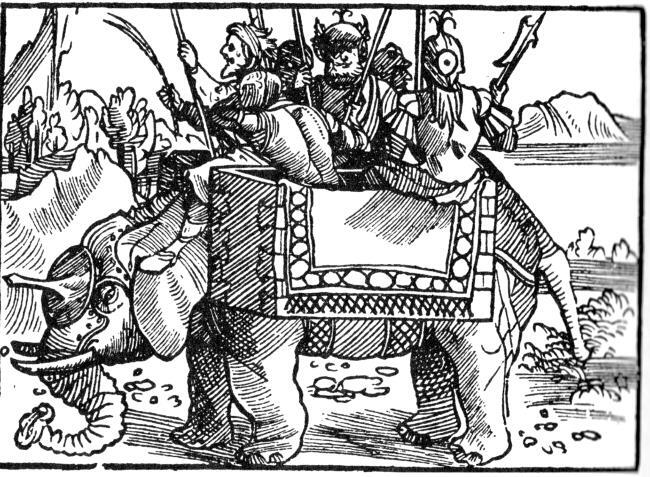 Рис. 24. Индийский боевой слон, несущий воинов в двух корзинах. Гравюра из немецкого перевода итальянского оригинала книги Людовико де Вартема (1515 г.), который путешествовал по Гуджарату, Малабарскому берегу, Декану и Виджиянангару в 1503–1510 гг. Воспроизведено по: Ludovico de Varthema. Reisen im Orient / Eingeleitet, übersetzt und erläutert von F. Reichert. (Fremde Kulturen in alten Berichten. Bd. 2.) Sigmaringen, 1996. S. 142, Abb. 29.