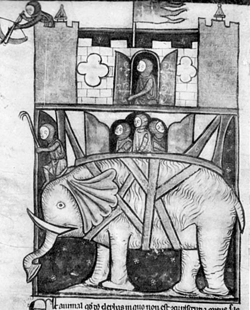 Рис. 25. Боевой слон с двухэтажной башней. Средневековая европейская миниатюра. MS. 22, F XIII, Westminster Chapter Library. Воспроизведено no: Druce G. C. The Elephants in Medieval Legend and Art // The Archaeological Journal. 2nd Series. Vol. 26 (77). London, 1919. P. 43. Pl. VI, 2.