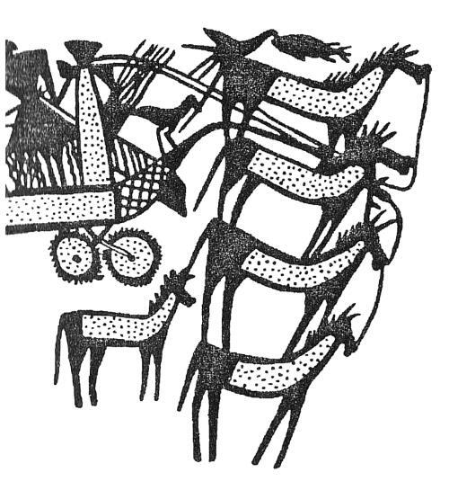 Рис. 34. Боевая повозка, запряженная четырьмя онаграми. Полихромный сосуд из Хафадже (Центральная Месопотамия; рубеж IV–III тыс. до н. э.). Воспроизведено по: Нефедкин А. К. Боевые колесницы и колесничие древних греков (XVI–I вв. до н. э.). СПб., 2001. С. 40.