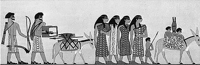 Рис. 36. Азиаты, приносящие дары. Фреска из Бени-Хасана в Верхнем Египте (последняя четверть XX – первая четверть XIX в. до н. э.). Воспроизведено по: Херцог X, Гишон М. Библейские сражения ⁄ Пер. Т. Лисицыной. М., 2005. С. 35.
