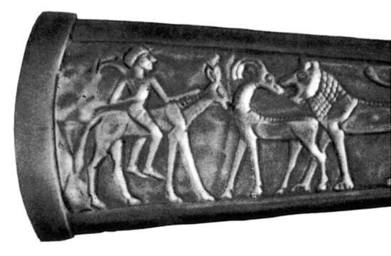 Рис. 37. Мужчина, вооруженный кривым мечом, едущий на осле; золотые ножны из храма в Библе (XIX–XV вв. до н. э.). Воспроизведено по: Klengel Н. Geschichte und Kultur Altsyriens. Leipzig, 1979. S. 64. Taf. 17.