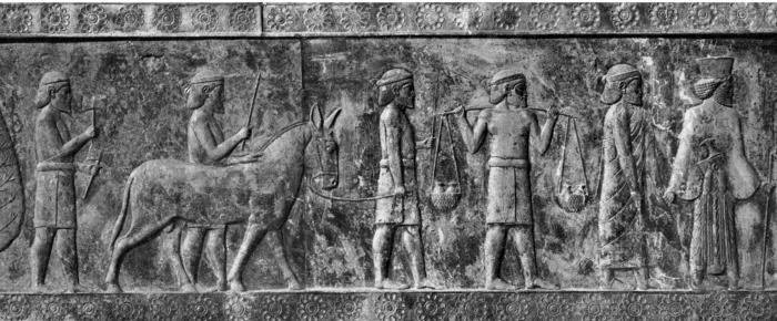 Рис. 38. Восемнадцатая делегация на рельефе персепольской Ападаны – делегация индийцев (V в. до н. э.). Воспроизведено по: Walser G. Die Völkerschaften auf den Reliefs von Persepolis: Historische Studien über den sogenannten Tributzug an der Apadanatreppe. Berlin, 1966. Taf. 25.