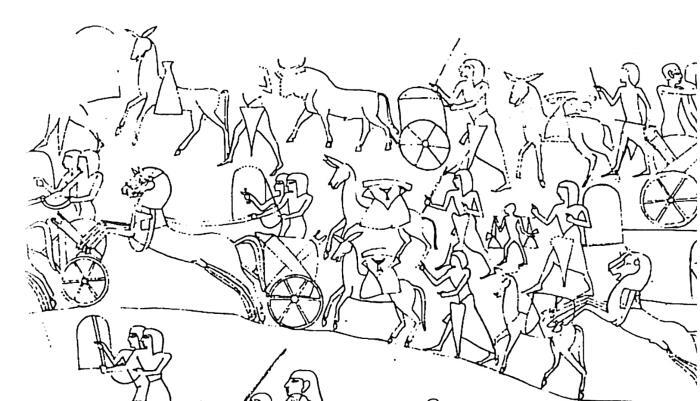 Рис. 39. Египетская походная колонна: ослы везут тюки, а бык тащит колесницу; погонщики сопровождают животных. Фрагмент рельефного панно из Абу-Симбела, изображающее битву при Кадеше (ок. 1300 г. до н. э.). Воспроизведено по: Нефедкин А. К. Боевые колесницы и колесничие древних греков (XVI–I вв. до н. э.). СПб., 2001. С. 79.