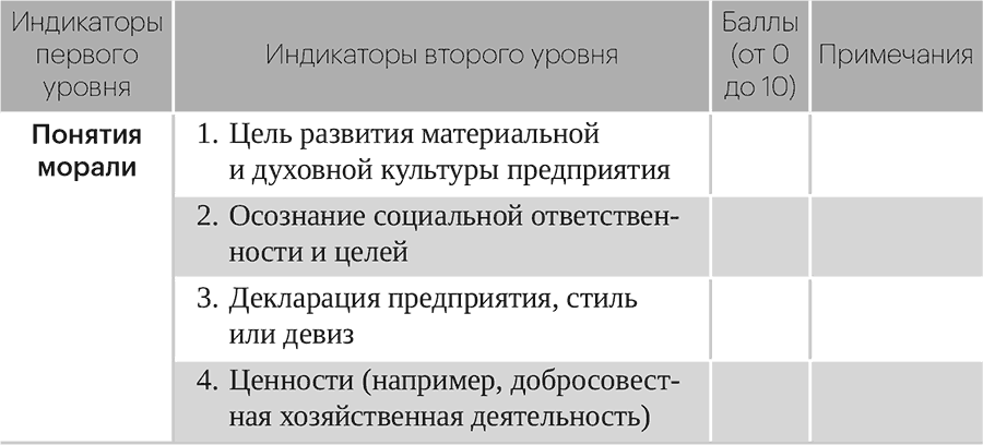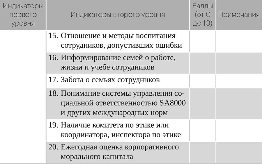 Моральный капитал хотя и не поддается измерению, может быть оценен на основе корпоративного нравственного поведения и его проявлений. Конечно, показатели для оценивания морального капитала предприятий также являются показателями корпоративной этики.