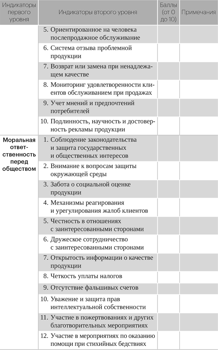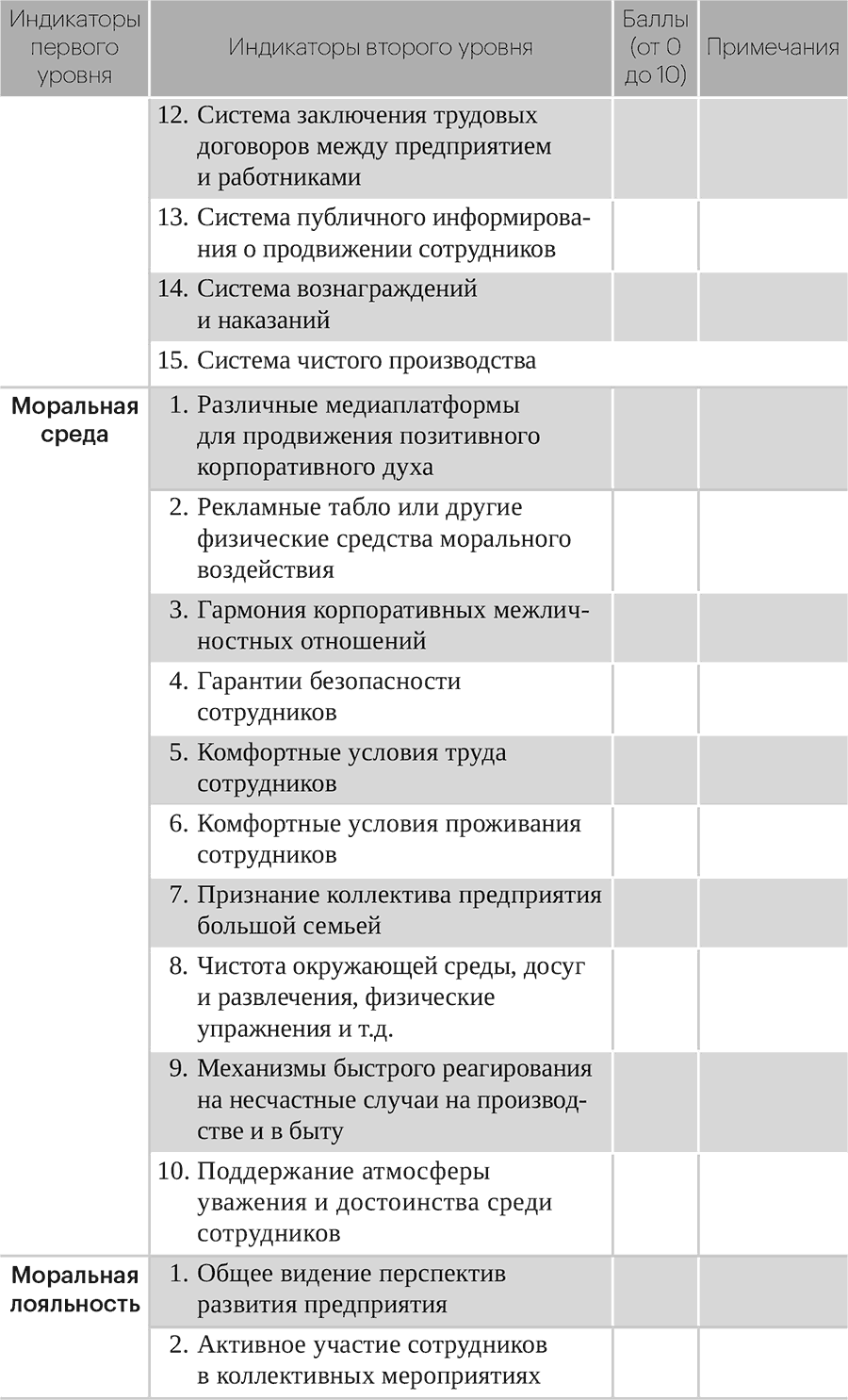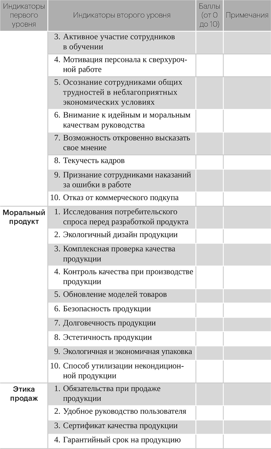 Восемь индикаторов первого уровня оценивания морального капитала предприятий далее могут быть разделены на 100 индикаторов второго уровня, которые вполне применимы и работоспособны. В зависимости от ряда характеристик (наличия или отсутствия, хорошего или плохого качества, высокого или низкого уровня, сильного или слабого содержания, большего или меньшего присутствия) им присваивается оценка от 0 до 10 баллов (целое число 10 удобно для начисления и подсчета, что способствует повышению достоверности процесса оценивания) с полной суммой в 1000 баллов. Оценивание на основе процентной системы (привычное рассмотрение чисел способствует сравнению уровней оценивания) производится по формуле: «общая оценка = фактический общий балл ÷ 10».