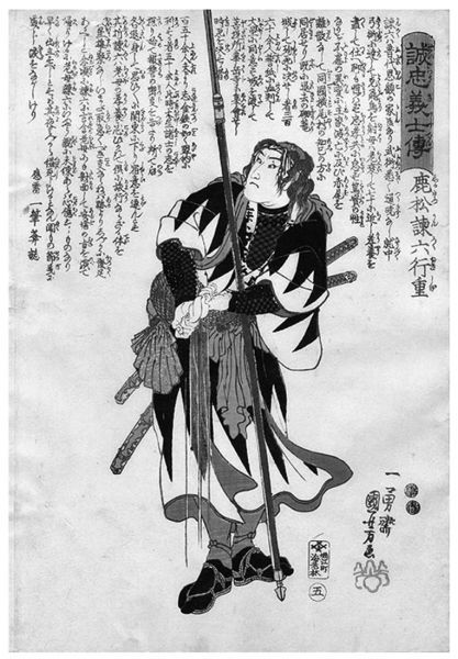 Сакагаки Гэндзо Масаката, восседающий с копьем в руке на сломанном постаменте. Утагава Куниёси. XIX в.