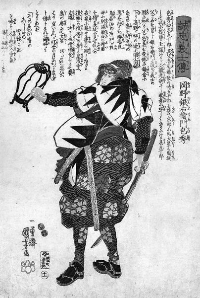 Окано Гинъэмон Канэхидэ, держащий в правой руке меч, а в левой – фонарь. Утагава Куниёси. XIX в.
