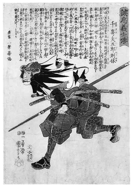 Сэндзаки Ягоро Нориясу, бегущий с копьем в руке. Утагава Куниёси. XIX в.