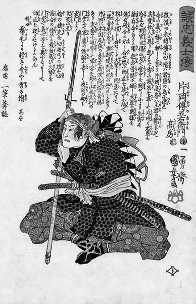 Катаока Дэнгоэмон Такафуса в окровавленной головной повязке, опирающийся на свое обагренное кровью копье. Утагава Куниёси. XIX в.