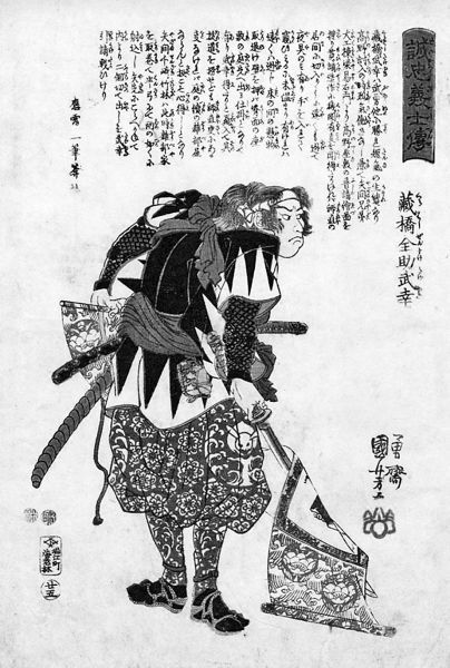 Курахаси Дзэнсукэ Такэюки с сорванным со стены свитком, висящим на лезвии меча. Утагава Куниёси. XIX в.