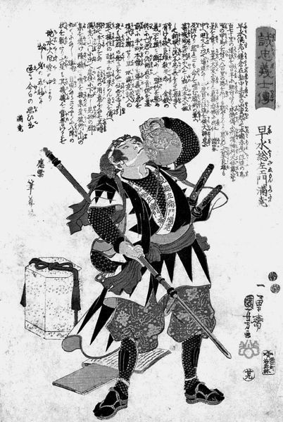 Онодэра Тоэмон Хидэтомэ затягивает шнурок своей сандалии, поставив ногу на опрокинутый столик для игры в го. Утагава Куниёси. XIX в.