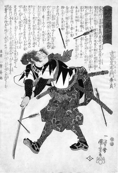Ёсида Садаэмон Канэсада, разрубающий летящие вражеские стрелы. Утагава Куниёси. XIX в.