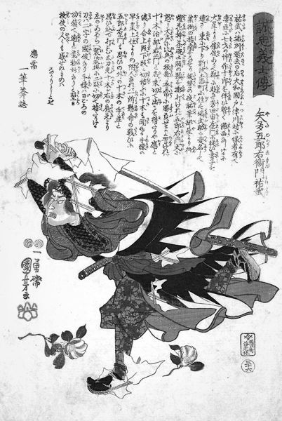 Ята Гороэмон Сукэтакэ, бегущий среди обломков сёдзи и рассыпанных цветов. Утагава Куниёси. XIX в.