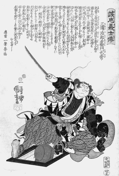 Миура Дзироэмон Камэцукэ, вытянув вперед руку с мечом, падает на корзину с углем. Утагава Куниёси. XIX в.