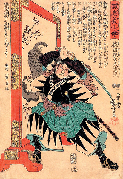 Токуда Магодаю Сигэмори, притаившийся за высокой ширмой с изображением птицы. Утагава Куниёси. XIX в.