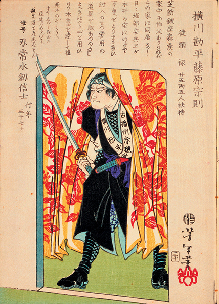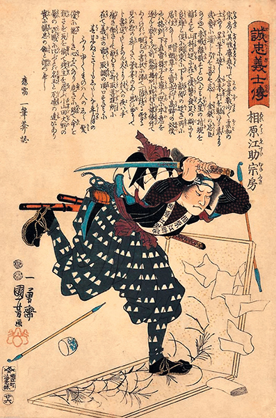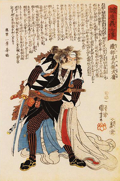 Орибэ Ясубэй Такэцунэ, держащий в руках ночную одежду Моронао. Утагава Куниёси. XIX в.