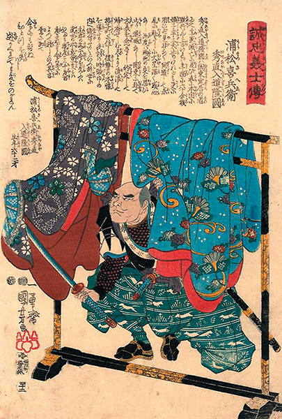 Урамацу Кихэй Хидэнао изображен в одной из комнат особняка, где на специальной подставке развешаны женские кимоно. Утагава Куниёси. XIX в.