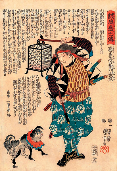 Кацута Синэмон Такэтака с фонарем в руке, обнаруживши следующую за ним комнатную собачку. Утагава Куниёси. XIX в.