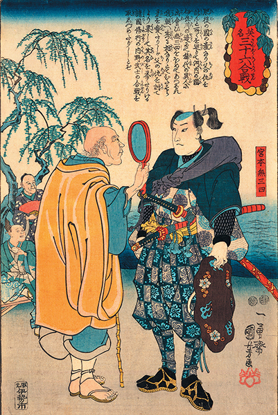 Мужчина, разглядывающий через лупу знаменитого фехтовальщика Миямото Мусаси. Утагава Куниёси. XIX в.