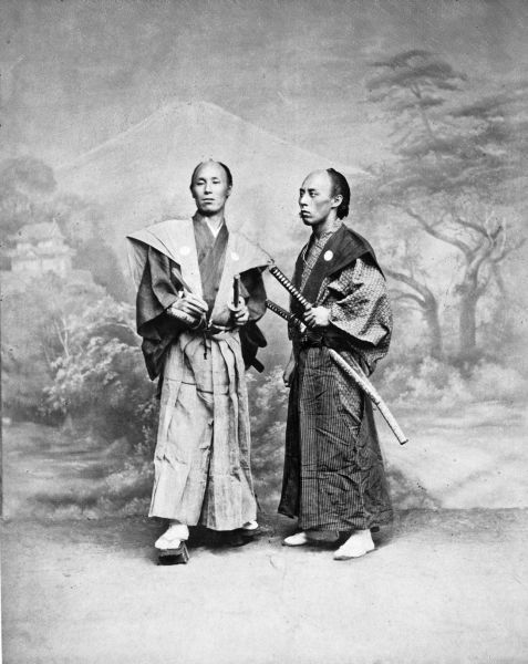 Самурай на коленях перед государственным чиновником или дайме. Фотография. 1877.