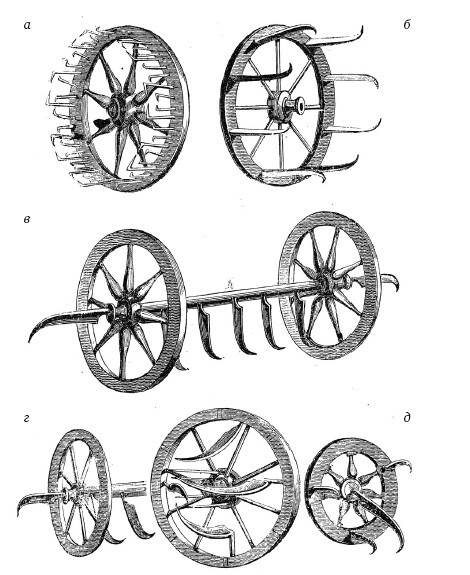 Реконструкции вооружения колес колесницы, а) Иллюстрация реконструкции М. Рад ера вооружения колеса персидской серпоносной колесницы, б) Реконструкция колеса по описанию М. Радера (1670 г.), в) Реконструкция И. Шеффером оси и колес колесницы с серпами (1671). г) Колесо реконструкции серпоносной колесницы, помещенной в издание Г. Штевееша (1592 г.), б) Расположение серпов на колесе, как это представлял Я. Перизоний.