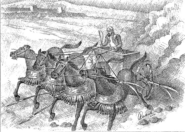 Что касается конструкции кузова квадриги, то об этом у нас данных нет, но возможно, она не изменилась, как осталось прежним и количество коней. Видимо, кони либо совсем не имели брони, либо были прикрыты лишь частично, ведь в бою их сильно поражали метательные снаряды (Liv., XXXVII,41,10).