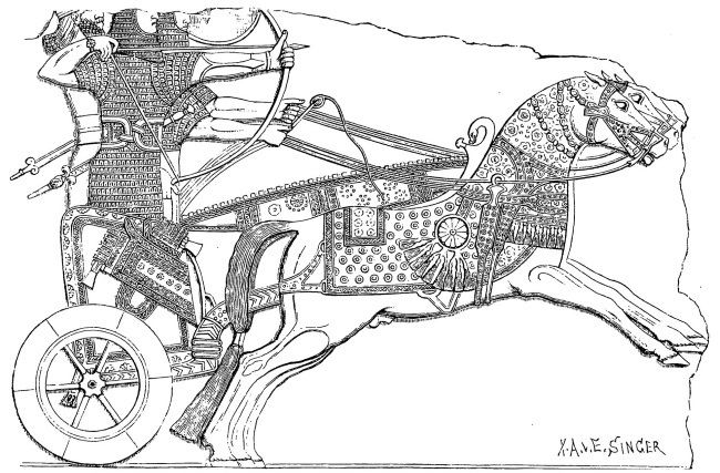 Боевая ассирийская трига. Рельеф дворца Ашшурназирпала II (884–858 гг. до н. э.) из Нимруда. British Museum, London. Лучник и возница одеты в длинных панцири, чешуйки которых обращены вверх. Щитоносец же не защищен панцирем.
