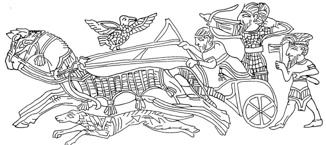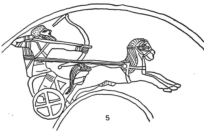 Фрагмент сцены охоты на колеснице восточного типа, изображенной на боковой стенке ларца из слоновой кости из Энкоми на Кипре (1200–1150 гг. до н. э). British Museum 97/4-1/996, London. К восточным элементам упряжки относится попона, стяжка дышла и верха кузова, шесть спиц в колесе. Отметим, что колесницу сопровождает пеший спитник с секирой в одежде похожей на одеяние филистимлян.