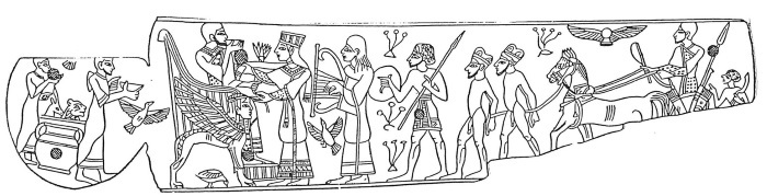 Триумф и пир хананейского князя. Плакетка из слоновой кости, Мегиддо (ок. 1200 г. до н. э.). Колесница князя напоминает египетский тип, но у нее на боковой стенке кузова укреплено копье – признак, характерный для азиатских упряжек.
