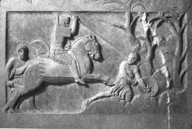 Сцена боя персидского всадника с пехотинцем. Рельеф боковой стенки мраморного саркофага из Чана, где был погребен молодой мужчина (первая четверть IV в. до н. э.). Музей Чанаккале (северо-западная Турция). Знатный всадник, одетый в розовую рубаху, защищен красным (видимо, кожаным) панцирем с наплечниками, двумя рядами птериг и с высоким воротом. Акинак свешивается с его белого пояса. На ногах – поножи и белая обувь. На розовом коне одет налобник с вырезами для глаз, попона, и, возможно, белый нагрудник. Всадника сопровождает воин, одетый в белую рубаху и красные штаны. Он вооружен круглым щитом, двумя копьями и махайрой. Поверженный противник в белой рубаха пытается вытащить меч. Он находится под деревьями, где сидит сокол.