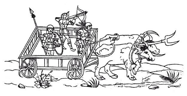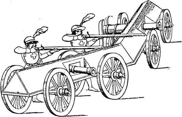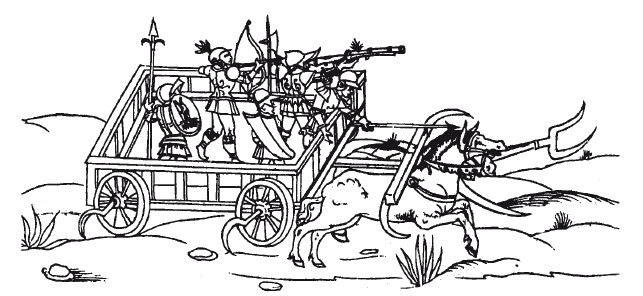 С появлением в течение XIV–XV вв. на полях сражений стойкой пехоты, состоящей из швейцарских пикенеров, а с XVI в. и немецких ландскнехтов и с постепенным вытеснением ими всадников-рыцарей, ситуация изменяется. Теперь подобные повозки могли предназначаться для вкатывания в медленно наступающие плотно построенные пехотные отряды. Впрочем, подобные случаи нам не известны. По этому поводу А. П. Агапеев справедливо замечает: «Для атаки расположения противника (преимущественно – его пикинерных батальонов), боевые повозки стали снабжаться косами, серпами, рядами пик; лошадей отпрягали и затем, управляя оглоблями, проникали с этими повозками в середину неприятельских сомкнутых частей, а вслед за ними, прикрываясь щитами-павезами, врывались в образовавшиеся разрывы мечники и алебардисты, которые шли непосредственно за повозками»165. М. Вертело, основываясь лишь на текстах трактатов, полагал, что такие машины были особенно распространены в Германии и Италии166. Однако, насколько реально они были распространены сказать довольно сложно.