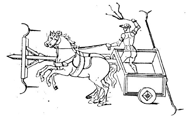 В период средних веков настоящие серпоносные квадриги перешли в область теоретических проектов, что, впрочем, и естественно при низких финансовых возможностях феодальных сеньоров и господстве рыцарской конницы на поле боя. В этом еще раз мы убеждаемся, видя иллюстрации того времени, изображающие колесницы с серпами. Так, в книге итальянского инженера Роберто Вальтурио (1405–1475) мы найдем два рисунка упряжек с серпами, вставленных в рассказ о битве при Магнезии, опирающийся, в свою очередь, на свидетельства Тита Ливия112. Тут мы видим четырехколесные телеги с серпами на осях и своеобразным «прихватом» спереди, запряженные парой лошадей и быков. Кроме того, в кузове одной повозки стоят четыре, а в другой два воина. Один солдат, стоящий в повозке, даже стреляет из аркебузы!113 Более реалистичен рисунок двухколесной серпоносной биги в рукописи другого итальянского инженера Марьяно Якоба (1382- ок. 1458) «Десять книг о машинах» (1449 г.), в которой автор сообщает, что «колесница с двумя колесами, тащимая бронированными конями, тогда как оруженосец её ведет, полезна для разрыва вражеских строев»114. Ясно представляя себе цель применения серпоносных колесниц, автор дал оригинальное расположение серпов на упряжке, что является, по-видимому, инновацией автора. Вместе с тем художник явно изображал реалии не своей эпохи, о чем свидетельствуют доспехи возницы. Эти и подобные им изображения показывают что в XIV–XV вв. довольно плохо представляли себе конструкцию, а отчасти и использование серпоносной колесницы древности115. Художники просто комбинировали описания латинских авторов (Ливия, анонима «О военных делах») и конструкцию современной им повозки.