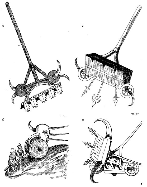 Рисунки военных машин из рукописи Конрада Кизера «Bellifortis» (1395–1405 гг.). а, г) передвижная рогатка с зубчатыми остриями; б) передвижная рогатка в форме головы, в) передвижная рогатка Archimegara, с вертящейся «башней», на которой укреплены серпы и протозаны.