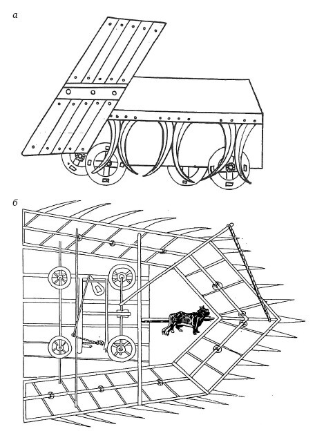 Рисунки военных машин-передвижных щитов из рукописи Конрада Кизера «Bellifortis» (1395–1405 гг.), а) Передвижное укрепление, защищенное по бокам парными серпами; б) передвижное укрепление, везущееся парой быков.