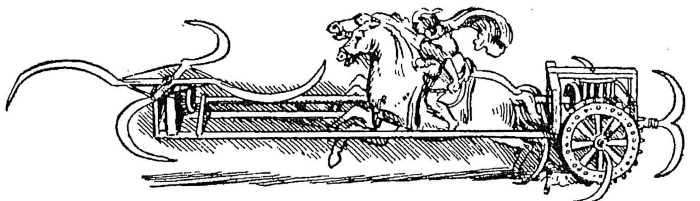Великий художник и ученый Леонардо да Винчи (1452–1519), вдохновлявшийся, как считает М. Вертело, тем же позднеантичным трактатом «De rebus bellicis»128, в своих записках разрабатывал своеобразную модифицированную конструкцию серпоносной биги, где четыре скрепленных в виде коловрата горизонтальных серпа были вынесены перед лошадьми. Они двигались по кругу с помощью зубчатой передачи от вращения колес, расположенных на кузове позади. Управлял всем сооружением верховой кучер129.