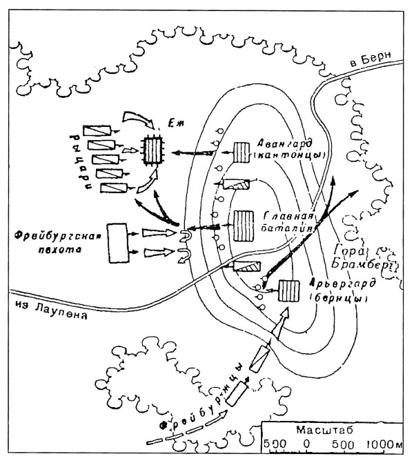 Если судить о битве при Лаупене (21 июня 1339 г.) по данным хроники швейцарского историка Эгидио Чуди (1505–1572), то швейцарцы так же применяли вооруженные повозки132. Данное сражение произошло между войском бернцев и их союзниками из лесных кантонов (вальдштедцами), с одной стороны, и армией сеньоров и союзного им города Фрайбурга, с другой стороны. Первых насчитывалось около 6000 человек, из которых 1000 бойцов пришло из лесных кантонов, армия вторых составляла примерно 15000 пехоты и 1000 конницы. Армия сеньоров сначала осадила городок Лаупен, занятый гарнизоном бернцев. На двенадцатый день осады жители Берна подходили, чтобы деблокировать город. Осаждающие двинулись против последних. Поскольку численность бернцев была меньшей, они избрали оборонительную тактику, встав на горе Брамберг. Согласно реконструкции Г. Дельбрюка, они построились тремя баталиями: авангард состоял из вальдштедцев, а главные силы и арьергард из бернцев. Их противники построились двумя массами рыцари встали против авангарда, а фрайбуржцы решили сразиться с главной баталией врага. Против арьергарда бернцев был выслан отряд, который обратил их в бегство. Двинулись в бой и главные силы сторон.